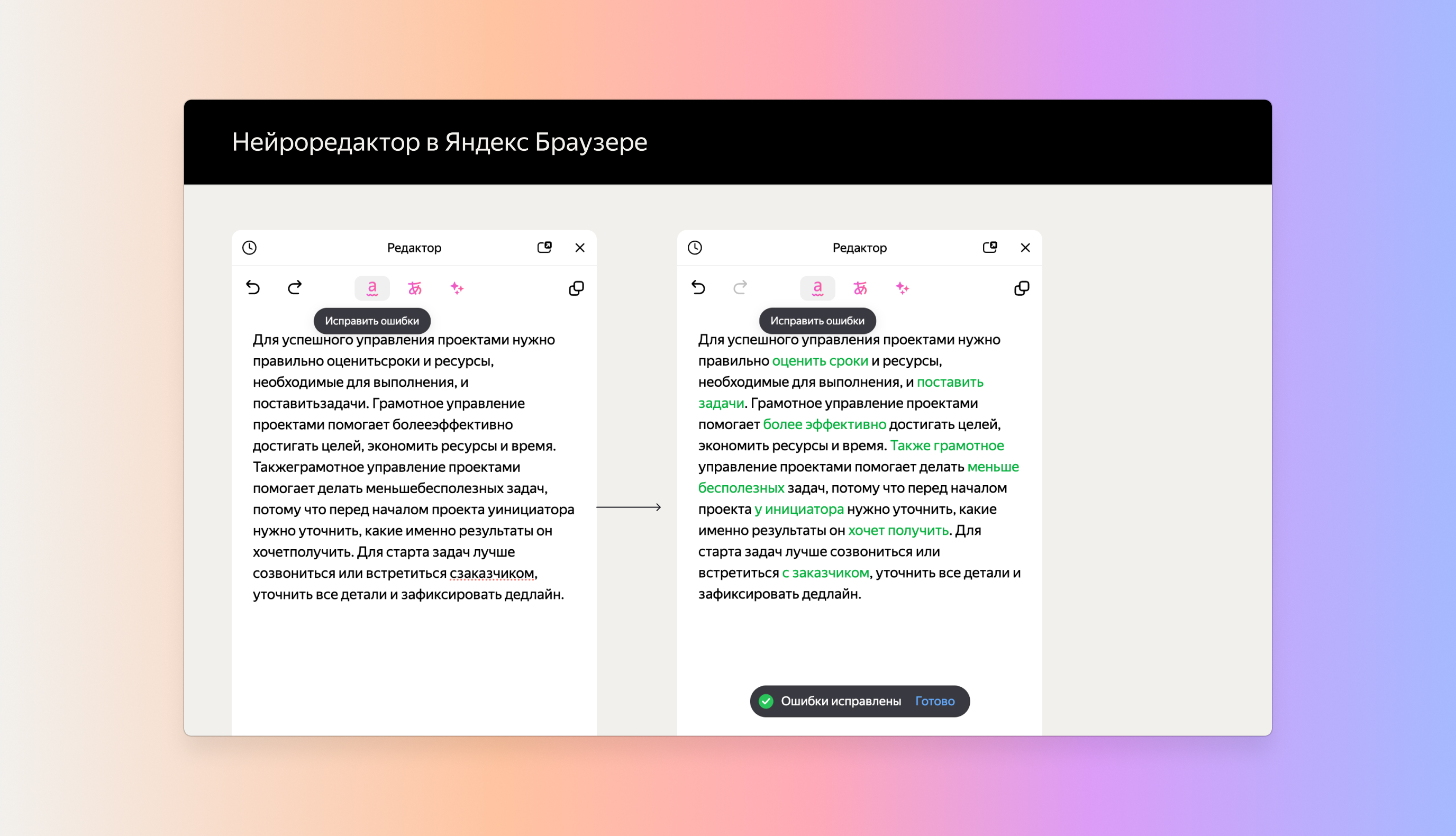 Нейроредактор работает на базе YandexGPT. Перед запуском продукта команда Браузера провела исследование и выяснила, какая помощь с текстами нужнее всего пользователям. Самым популярным оказался запрос на исправление орфографических, пунктуационных и грамматических ошибок.