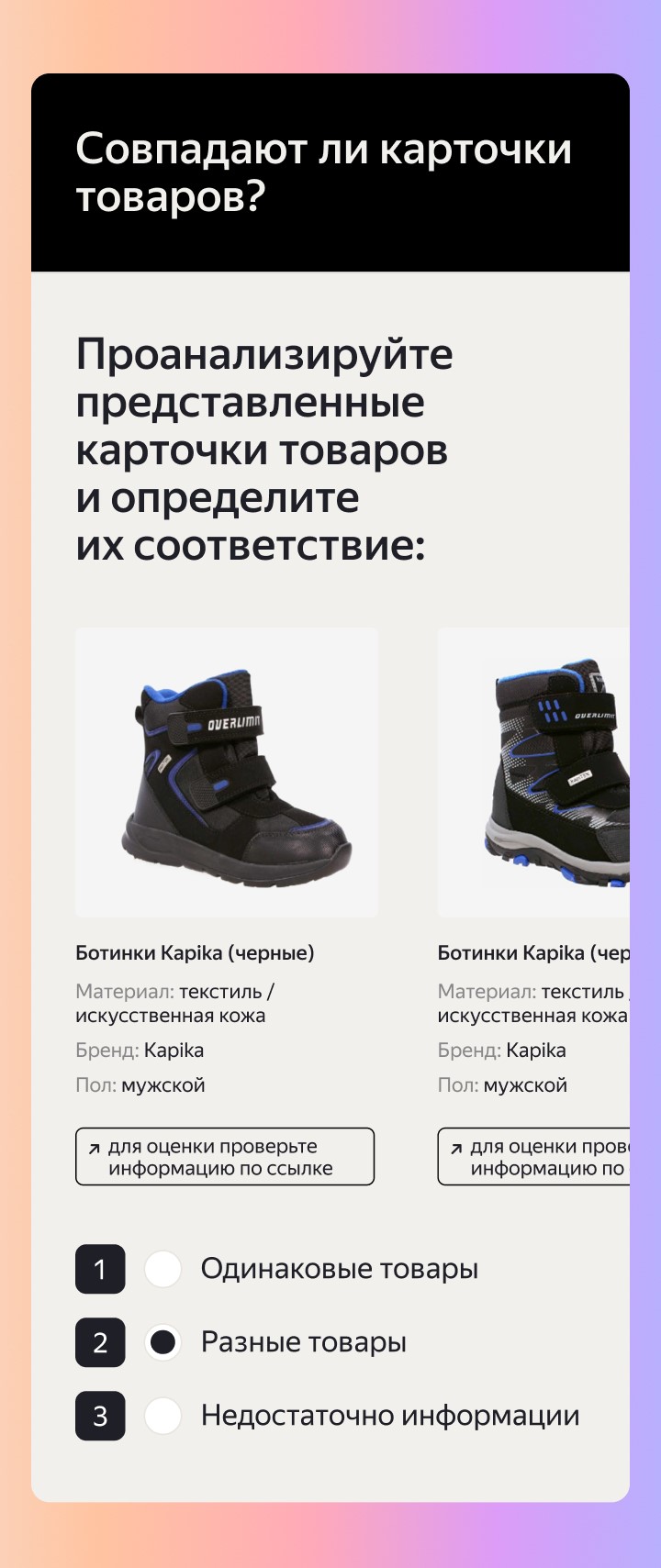 Задача исполнителей, которые работают на платформе Яндекс Задания, — сравнить карточки товаров Яндекс Маркета по параметрам и фото, чтобы «склеить» истинные пары в единый товар. Параметры поиска реальных пар отличаются и зависят от категории товара: например, одежда и обувь могут иметь одни характеристики сопоставления, тогда как электроника — совсем другие.