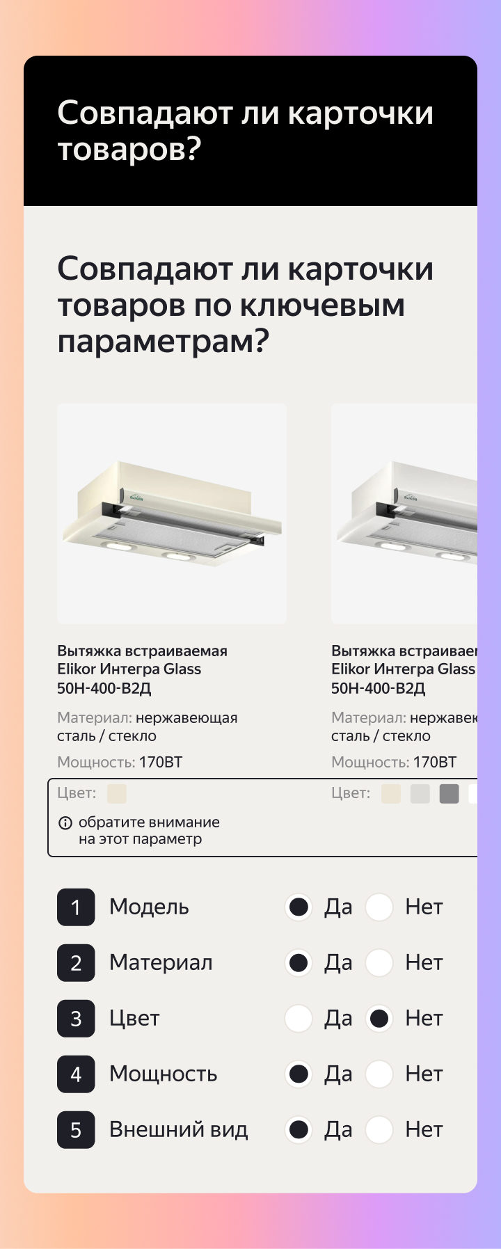Задание исполнителя может содержать вариант с одеждой всего с несколькими параметрами сопоставления или технику со множеством характеристик — в любом случае точность и полнота сравнения должны быть высокими.