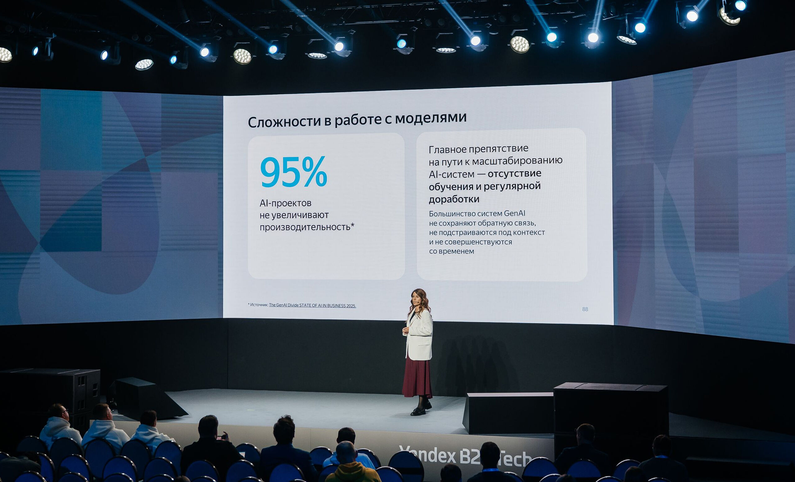 К 2030 году рынок AI и работы с данными удвоится и составит 855 млрд рублей. Такой прогноз прозвучал на конференции Partner Conf’25 от Yandex B2B Tech. Однако за красивыми цифрами роста пока стоит жёсткая статистика: 95% AI-проектов в крупных компаниях не приводят к росту производительности. Наша Business Development Manager Анастасия Панина в своём выступлении объяснила, почему так происходит.